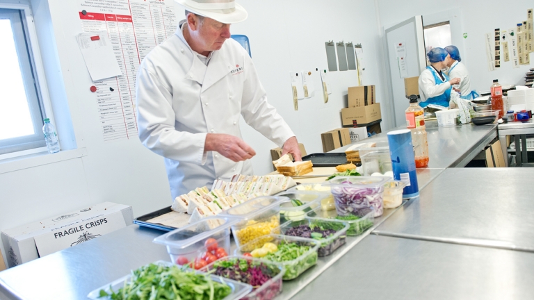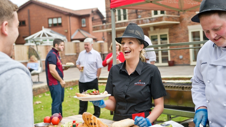 Services are broken down into Events Catering and Corporate Menu in a large burger menu, adding a new section for ‘on the go’ products.
